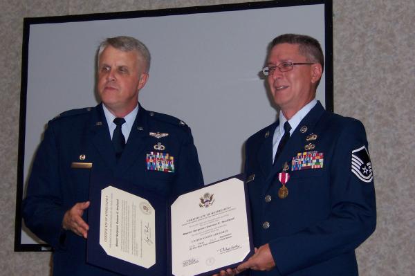 August 2007 - Picture of my commander awarding me my retirement certificate from Active Duty in the Air National Guard.
