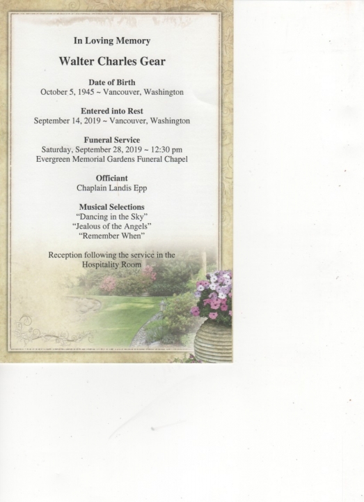 Born Oct 05, 1945, Walter C Gear attended Fort Vancouver High School in Vancouver, WA. View the obituary, post a memory, or share a photo about Walter C Gear.