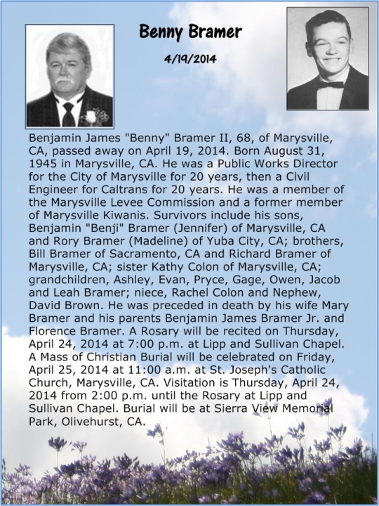 Born Aug 31, 1945, Benjamin Bramer attended Marysville High School in Marysville, CA. View the obituary, post a memory, or share a photo about Benjamin Bramer.