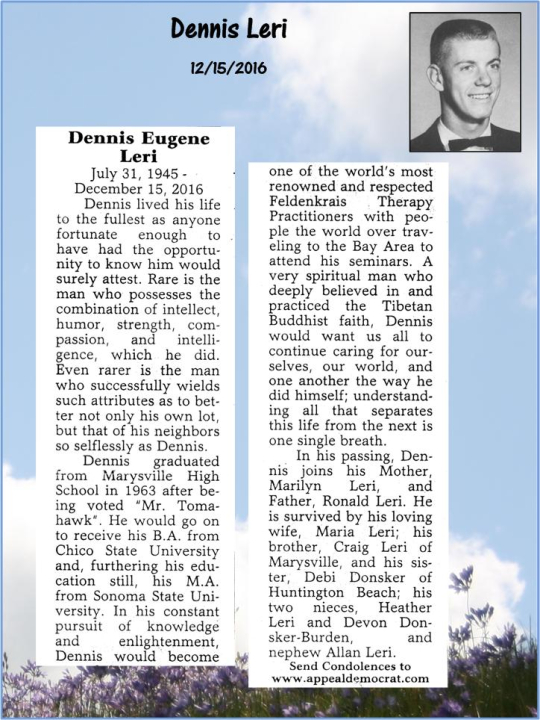 Born Jul 31, 1945, Dennis Leri attended Marysville High School in Marysville, CA. View the obituary, post a memory, or share a photo about Dennis Leri.