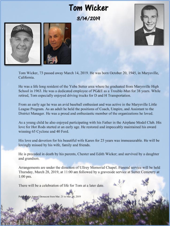Born Nov 20, 1945, Thomas Wicker attended Marysville High School in Marysville, CA. View the obituary, post a memory, or share a photo about Thomas Wicker.