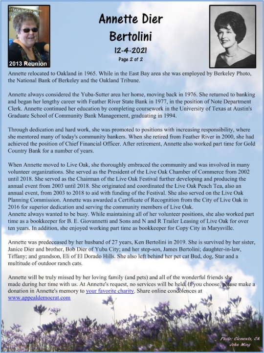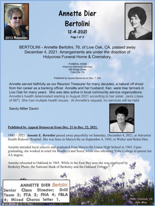 Annette (Dier) Bertolini attended Marysville High School in Marysville, CA. View the obituary, post a memory, or share a photo about Annette (dier) Bertolini.