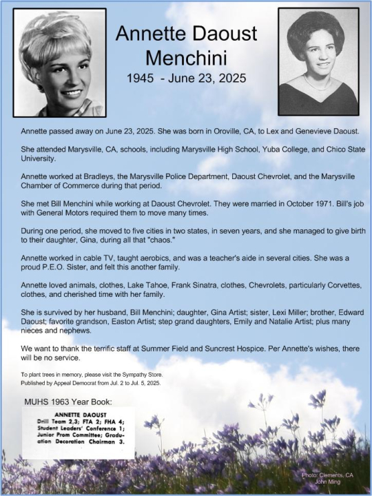 Annette (Daoust) Menchini attended Marysville High School in Marysville, CA. View the obituary, post a memory, or share a photo about Annette (daoust) Menchini.