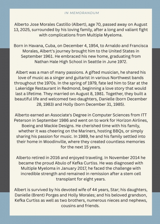 Born Dec 04, 2025, Albert Morales attended Nathan Hale High School in Seattle, WA. View the obituary, post a memory, or share a photo about Albert Morales.