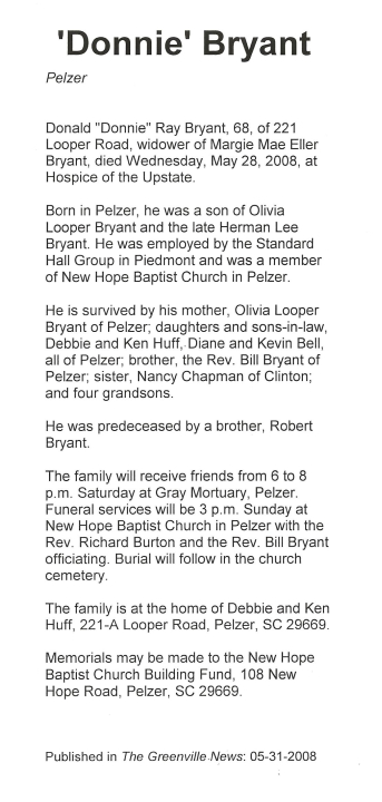 Born Apr 17, 1940, Donald Ray Bryant attended Palmetto High School in Williamston, SC. View the obituary, post a memory, or share a photo about Donald Ray Bryant.