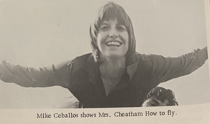 Mrs. Cheathum, cheerleader sponsor 1972-73. Mike lifted her at a pep rally.