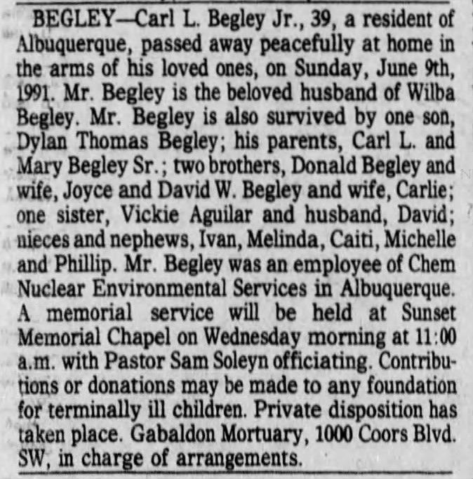 Born Mar 23, 1952, Carl Leroy Begley attended Sandia High School in Albuquerque, NM. View the obituary, post a memory, or share a photo about Carl Leroy Begley.