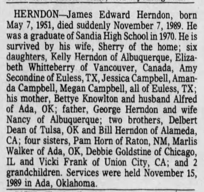 Born May 07, 1951, James Edward Herndon attended Sandia High School in Albuquerque, NM. View the obituary, post a memory, or share a photo about James Edward Herndon.