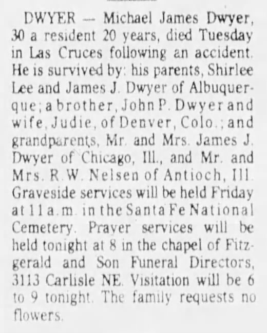 Born Aug 23, 1951, Michael James Dwyer attended Sandia High School in Albuquerque, NM. View the obituary, post a memory, or share a photo about Michael James Dwyer.