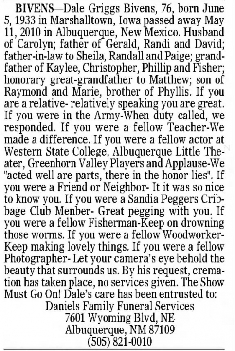 Born Jun 05, 1933, Dale Griggs Bivens was faculty at Sandia High School in Albuquerque, NM. View the obituary, post a memory, or share a photo about Dale Griggs Bivens.
