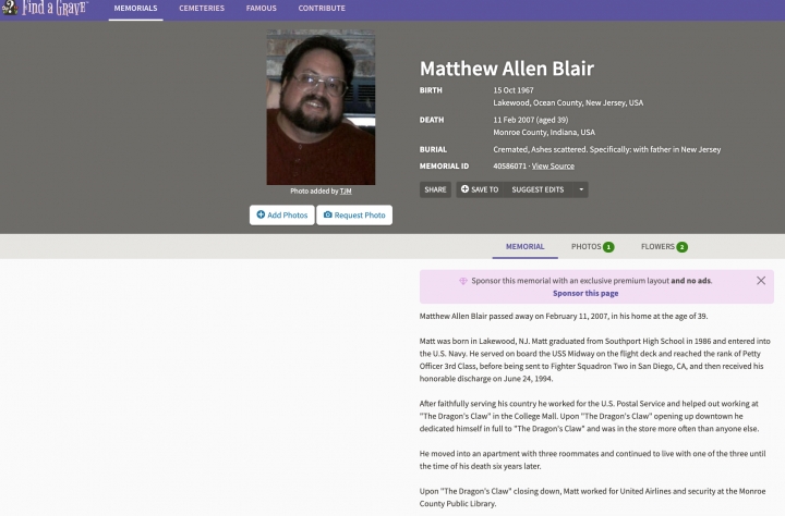 Matthew Allen Blair passed away on February 11, 2007, in his home at the age of 39.