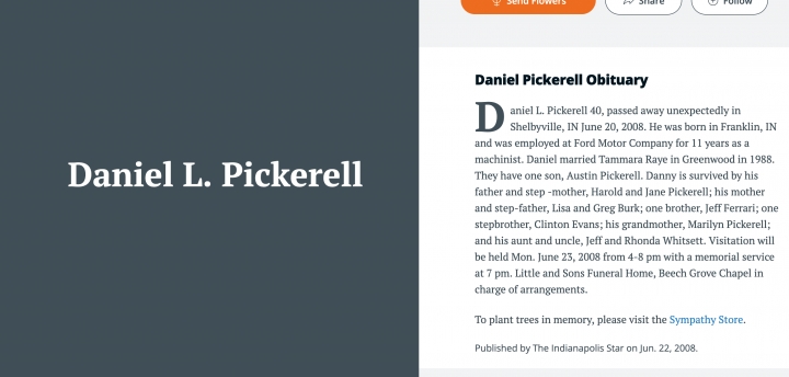 Daniel L. Pickerell 40, passed away unexpectedly in Shelbyville, IN June 20, 2008. He was born in Franklin, IN and was employed at Ford Motor Company for 11 years as a machinist. Daniel married Tammara Raye in Greenwood in 1988. They have one son, Austin Pickerell. Danny is survived by his father and step -mother, Harold and Jane Pickerell; his mother and step-father, Lisa and Greg Burk; one brother, Jeff Ferrari; one stepbrother, Clinton Evans; his grandmother, Marilyn Pickerell; and his aunt and uncle, Jeff and Rhonda Whitsett. Visitation will be held Mon. June 23, 2008 from 4-8 pm with a memorial service at 7 pm. Little and Sons Funeral Home, Beech Grove Chapel in charge of arrangements.