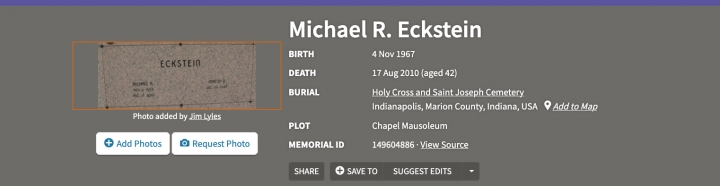 Michael Robert Eckstein 42, of Indianapolis, passed away August 17, 2010. He was born on November 4, 1967 in Chicopee, MA. He graduated from Southport High School in 1986. Mike worked for Vickery, Inc., Small Property Management Services and Hot Box Pizza. He enjoyed people, the great outdoors, bike riding, drawing and posting his beautiful photos on Facebook. He is survived by his father, Marty Eckstein; mother, Debbie Eckstein; two brothers, Jeff and Todd Eckstein; nephew, Noah and niece, Addy. Visitation will be Wednesday, September 22, 2010 from 4 p.m. until 8 p.m. in Daniel F. O'Riley Funeral Home, 6107 S. East Street (Hwy 31 South), Indianapolis, IN 46227. Funeral services will be on Thursday, September 23, 2010 at 10 a.m. in Daniel F. O'Riley Funeral Home. Burial will be in Forest Lawn Memory Gardens, 1977 South State Road 135, Greenwood, IN.