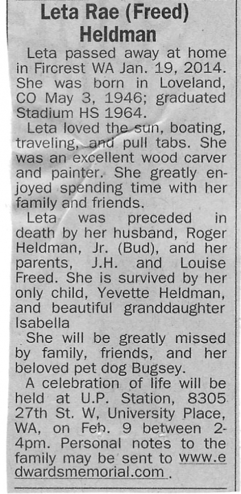 Born May 03, 1946, Leta Freed Heldman attended Stadium High School in Tacoma, WA. View the obituary, post a memory, or share a photo about Leta Freed Heldman.