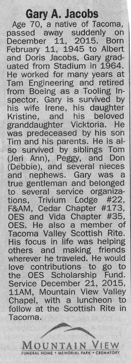 Born Feb 11, 1945, Gary Jacobs attended Stadium High School in Tacoma, WA. View the obituary, post a memory, or share a photo about Gary Jacobs.
