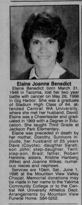 Born Mar 31, 1946, Elaine Hankins Benedict attended Stadium High School in Tacoma, WA. View the obituary, post a memory, or share a photo about Elaine Hankins Benedict.