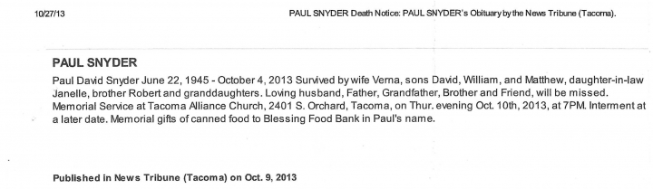 Born Jun 22, 1945, Paul Snyder attended Stadium High School in Tacoma, WA. View the obituary, post a memory, or share a photo about Paul Snyder.