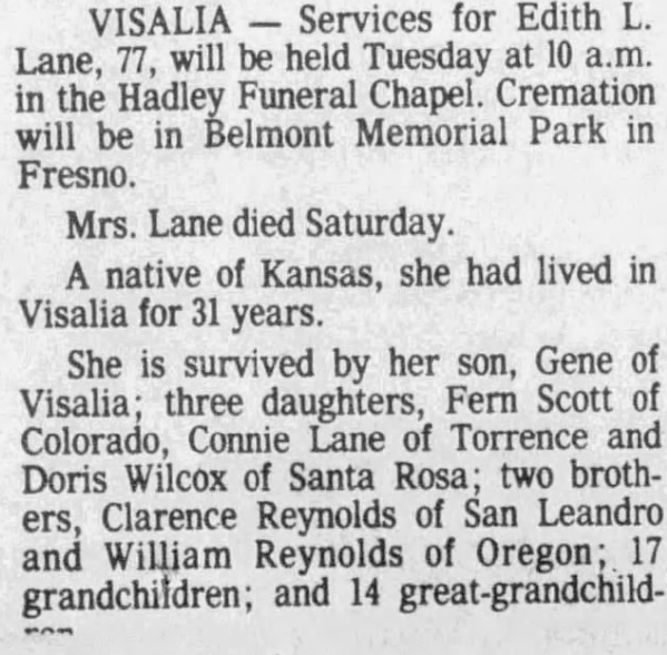 Edith Louella Reynolds Lane Obituary (1902 - 1980)