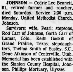Born Dec 13, 1901, Cedric Lee Bennett attended Stanton County High School in Johnson, KS. View the obituary, post a memory, or share a photo about Cedric Lee Bennett.