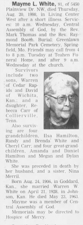 Mayme Louella Schroeder White Obituary (1906 - 1998)
