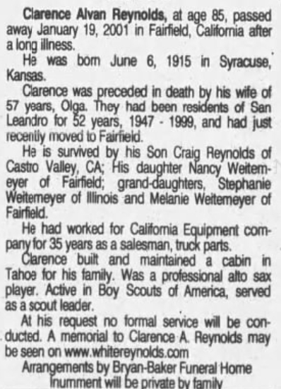 | About | Reporter, The (Vacaville, CA) - Tuesday, January 23, 2001 At his request, there will be no formal service for Clarence Alvan Reynolds, 85, of Fairfield. A memorial to Mr. Reynolds may be seen at www.whiteyreynolds.com. Inurnment will be private. Mr. Reynolds died Jan. 19, 2001, following a long illness. Born June 6, 1915, in Syracuse, Kan., Mr. Reynolds resided in Johnson, Kan. for 17 years and in San Leandro for 52 years until moving to Fairfield two months ago. He served in the Navy in WWII, worked for California Equipment Company for 35 years as a truck parts salesman. He built and maintained a cabin in Lake Tahoe for his family, was a professional alto saxophone player, and was active in Boy Scouts of America, serving as a scout leader. Mr. Reynolds is survived by his son, Craig of Castro Valley; daughter, Nancy Weitemeyer of Fairfield; and grandaughters, Stephanie Weitemeyer of Illinois and Melanie Weitemeyer of Fairfield. He was preceded in death by his wife of 57 years, Olga. Arrangements were being handled by Bryan-Braker Funeral Home. |