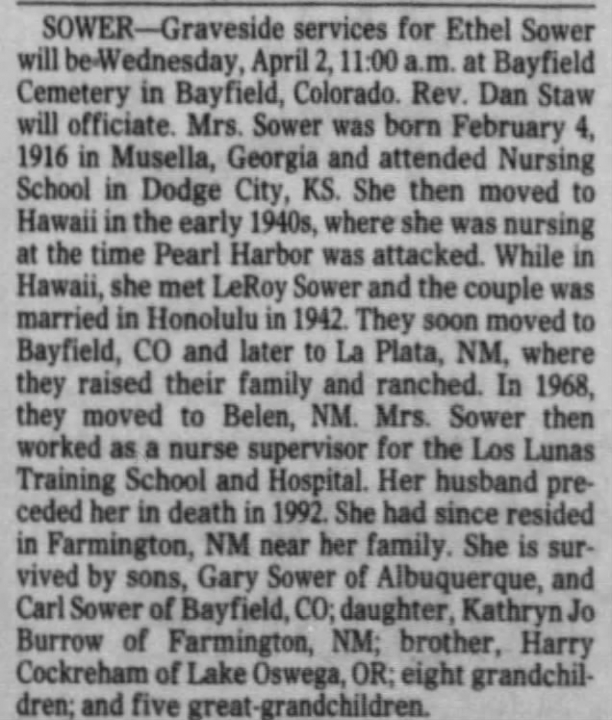 Ethel Nettie Cockreham Sower Obituary (1916 - 1997)