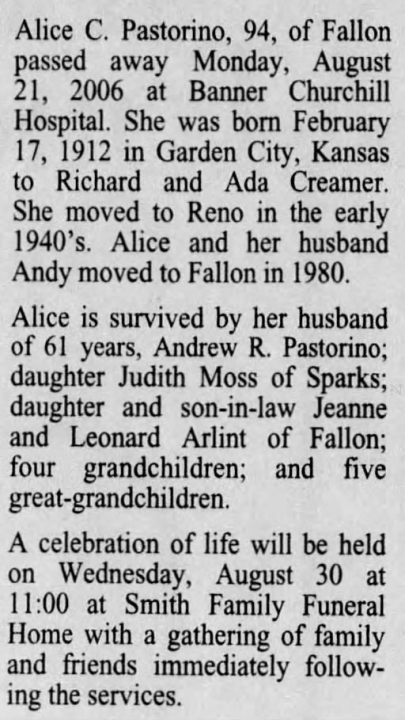 Alice C. Creamer Pastorino - M Obituary (1912 - 2006)