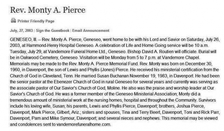 REV. MONTY A PIERCE attended West High School in Davenport, IA. View the obituary, post a memory, or share a photo about Rev. Monty A Pierce.