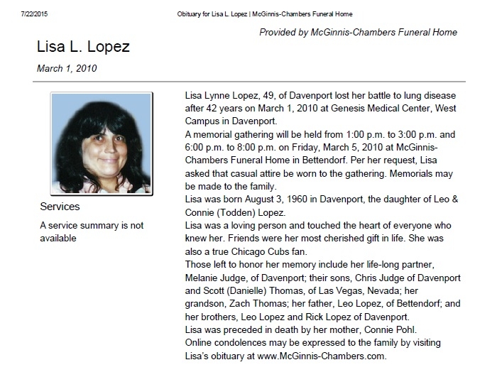 LISA LYNN LOPEZ attended West High School in Davenport, IA. View the obituary, post a memory, or share a photo about Lisa Lynn Lopez.