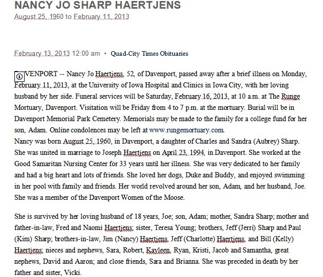 NANCY JO SHARP attended West High School in Davenport, IA. View the obituary, post a memory, or share a photo about Nancy Jo Sharp.