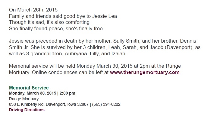 JESSIE LEA SMITH attended West High School in Davenport, IA. View the obituary, post a memory, or share a photo about Jessie Lea Smith.