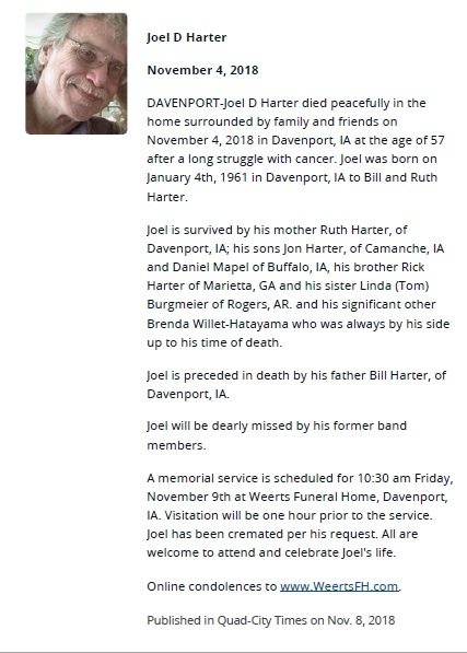 JOEL DAVID HARTER attended West High School in Davenport, IA. View the obituary, post a memory, or share a photo about Joel David Harter.