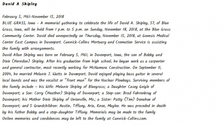 DAVID ALLEN SHIPLEY attended West High School in Davenport, IA. View the obituary, post a memory, or share a photo about David Allen Shipley.
