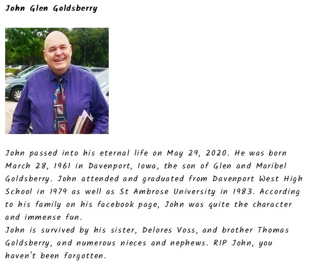 JOHN GOLDSBERRY attended West High School in Davenport, IA. View the obituary, post a memory, or share a photo about John Goldsberry.