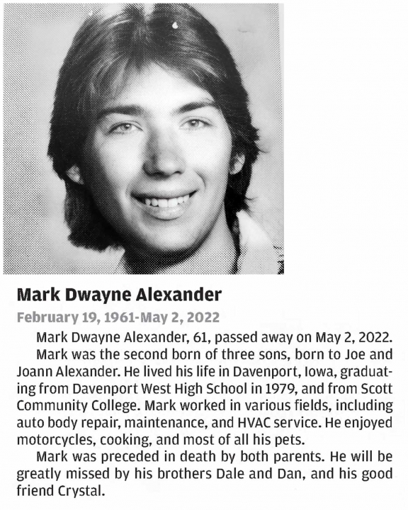 MARK DWAYNE ALEXANDER attended West High School in Davenport, IA. View the obituary, post a memory, or share a photo about Mark Dwayne Alexander.