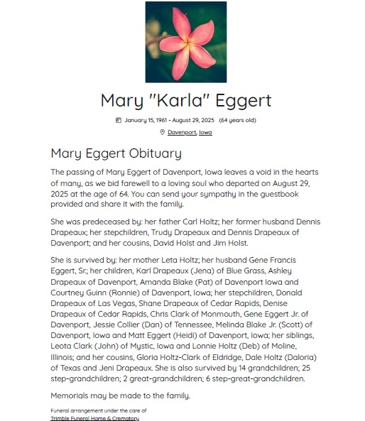 MARY KARLA HOLTZ attended West High School in Davenport, IA. View the obituary, post a memory, or share a photo about Mary Karla Holtz.